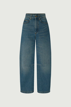 AGATHA is a jacket in thick denim, softened by a wash that preserves its deep indigo blue colour. Its unlined cut is boxy and short. Its brandeburg fastenings (tie closures) and piped finishes are details inspired by officer's clothing.